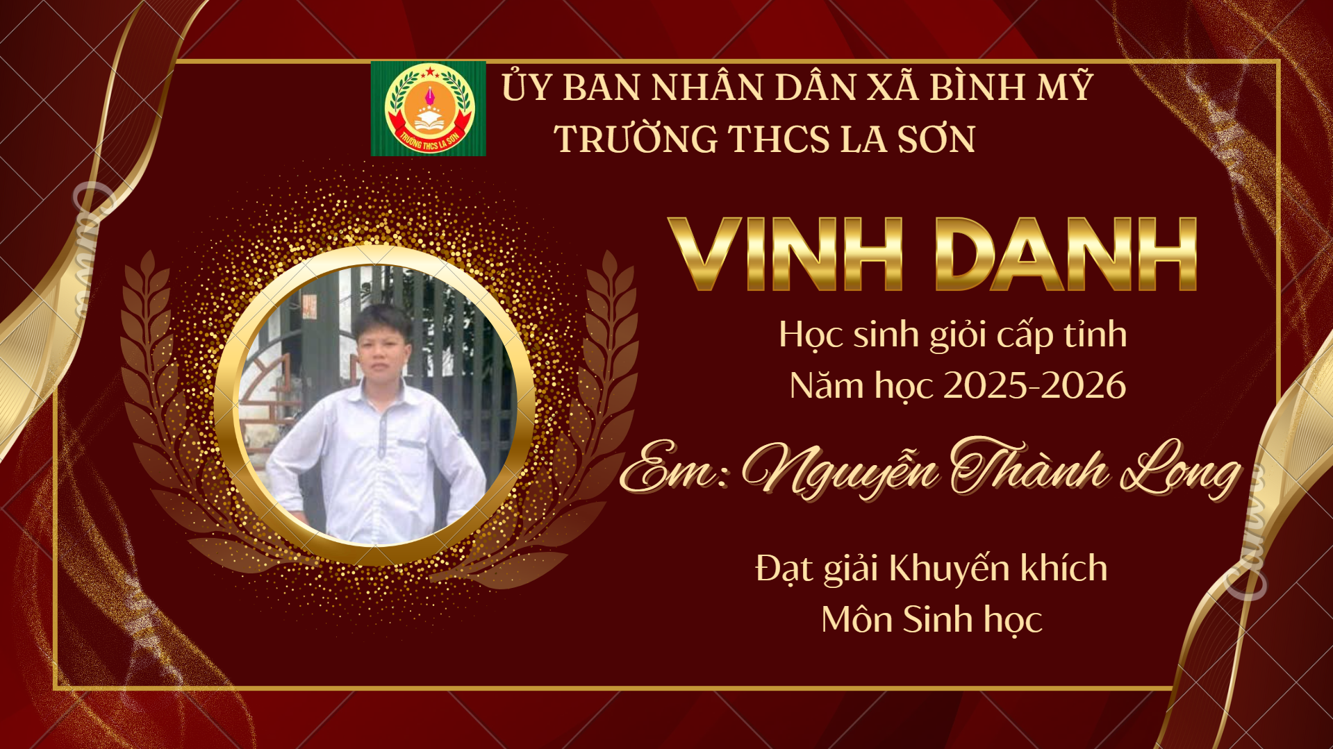 Trong Kỳ thi chọn học sinh giỏi tỉnh Ninh Bình năm học 2025-2026, Trường THCS La Sơn có 01 học sinh đạt giải . Đó là em Nguyễn Thành Long lớp 9B đạt giải khuyến khích môn KHTN (phân môn Sinh học). Đây là kết quả của quá trình nỗ lực học tập bền bỉ của em, cùng với sự tận tâm, trách nhiệm của thầy cô giáo giảng dạy.